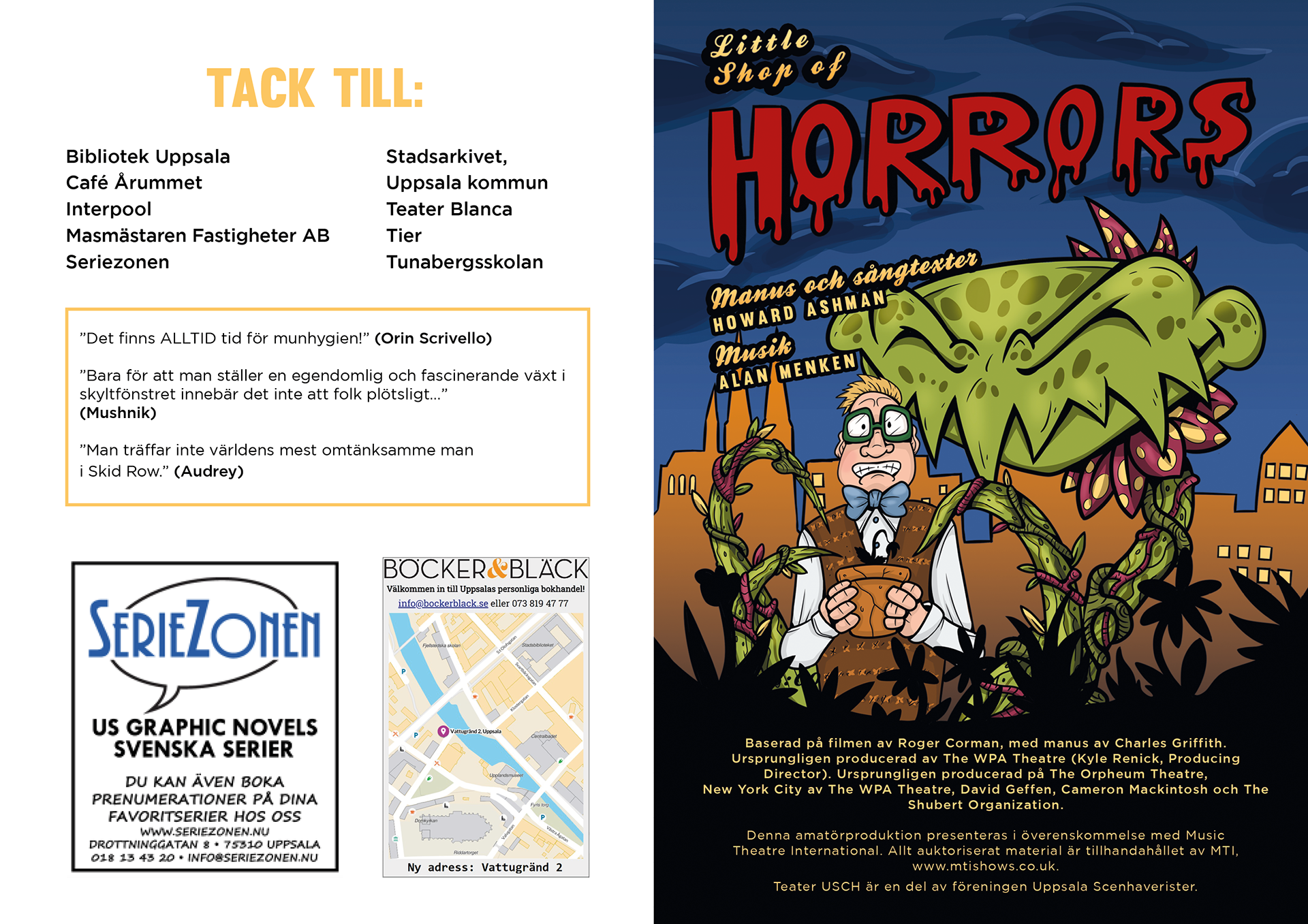 När den Uppsalabaserade teaterföreningen Teater USCH skulle sätta upp skräckmusikalen Little Shop Of Horrors ville de ha en affisch som förmedlade både skräcken och komiken i föreställningen. Det var viktigt att affischen hade sin egen visuella stil (i jämförelse med originalaffischen) samt att den knöt an till Uppsala. Bilden användes både som affisch och programblad.